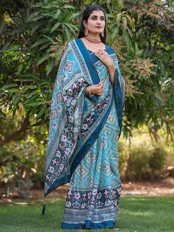 Firozi Patola Dola Silk Foil Print Saree With Blouse